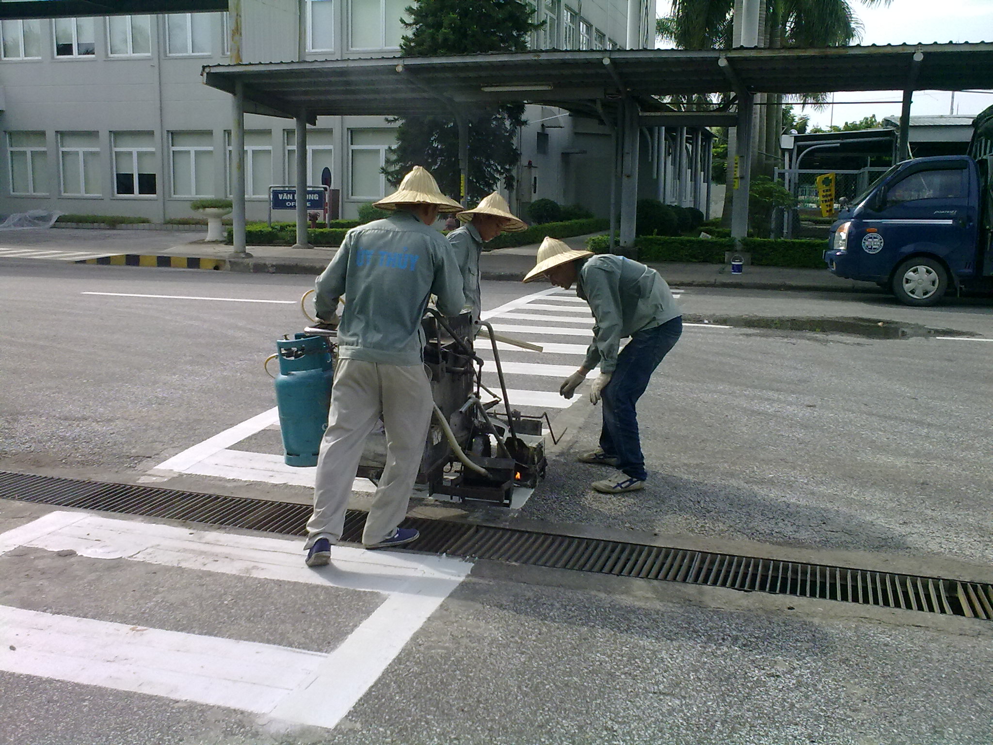 Thi công Sơn cảnh báo cho giao thông đường bộ và lối đi trong các nhà máy, xí nghiệp.