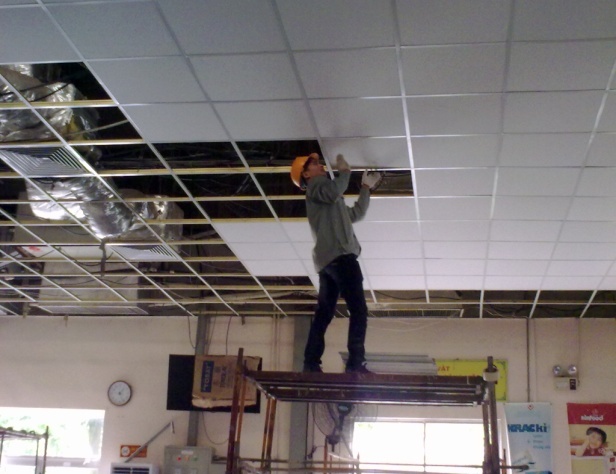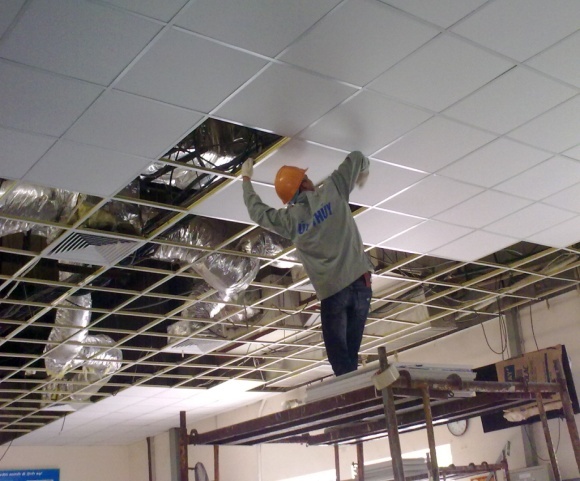 Sau khi cân chỉnh kung theo đúng cao độ, vuông góc và đều nhau và thả tấm trần lên. Ta vệ sinh mặt tấm và khung sạch sẽ trước khi bàn giao